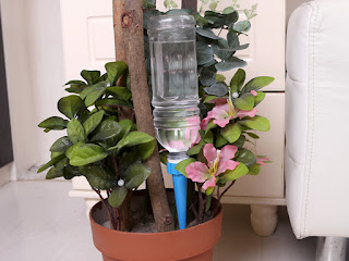 Até o porta cartas e chaves ganhou destaque com um pequeno vaso de flores e quando você precisar sair de casa por alguns dias, a garrafa pet ajuda a organizar como regar suas plantinhas!