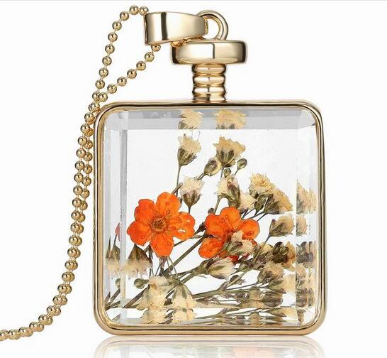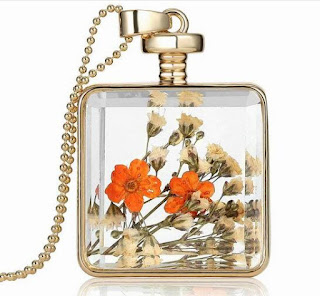 Há criações com flores secas em colares, muito criativas e em vidros de perfumes ficam muito decorativas.