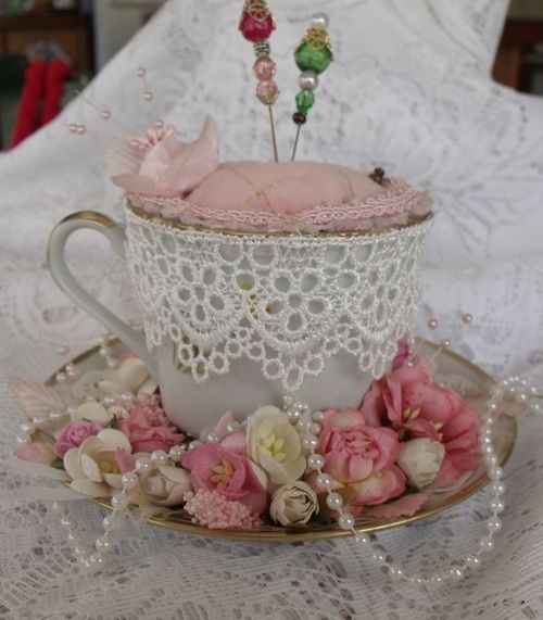 Numa xícara sem uso, faça uma bola de feltro e cole por dento com cola quente, arremate com flores e fita, pérolas e passamanaria, vão dar um ar vintage á peça.