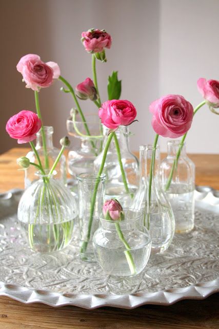Com um vidro cilíndrico, você coloca água no fundo e algumas flores ou numa taça você improvisa com uma única flor...e fica lindo!